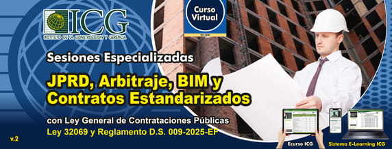 El Instituto de la Construcción y Gerencia ICG, tiene el agrado de invitar a los profesionales y alumnos a participar en el Sesiones Especializadas "JPRD, Arbitraje, BIM y Contratos Estandarizados, con Ley General de Contrataciones Públicas